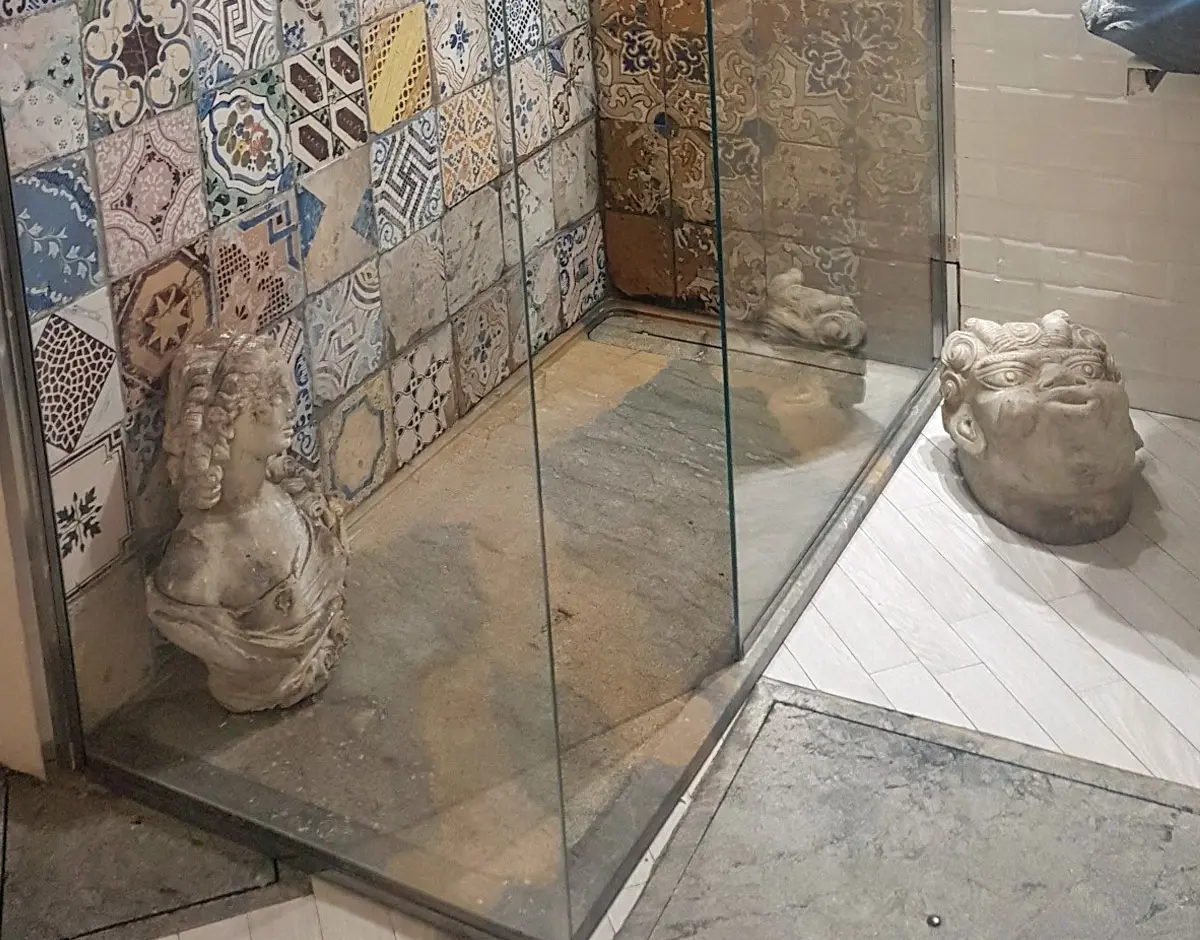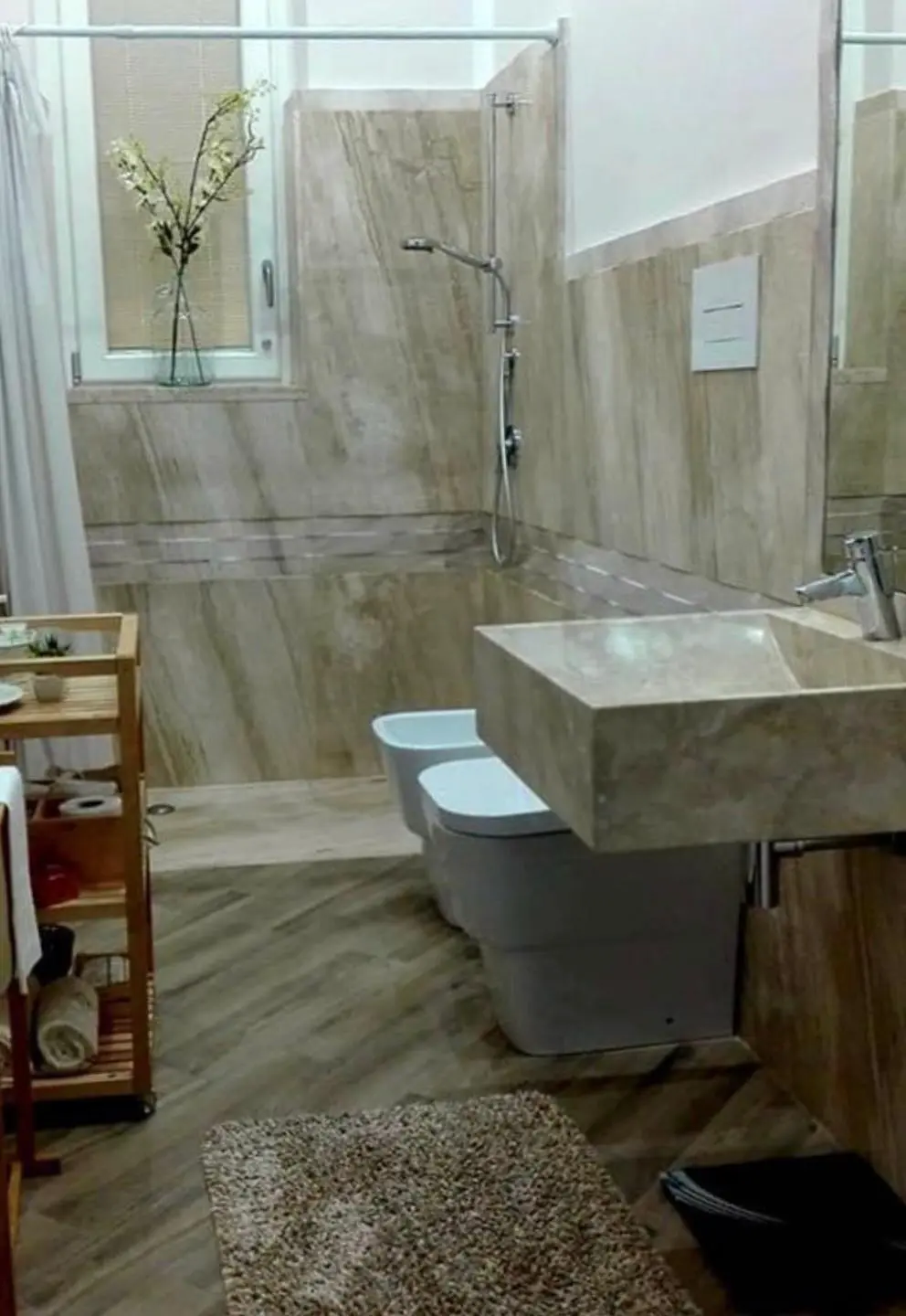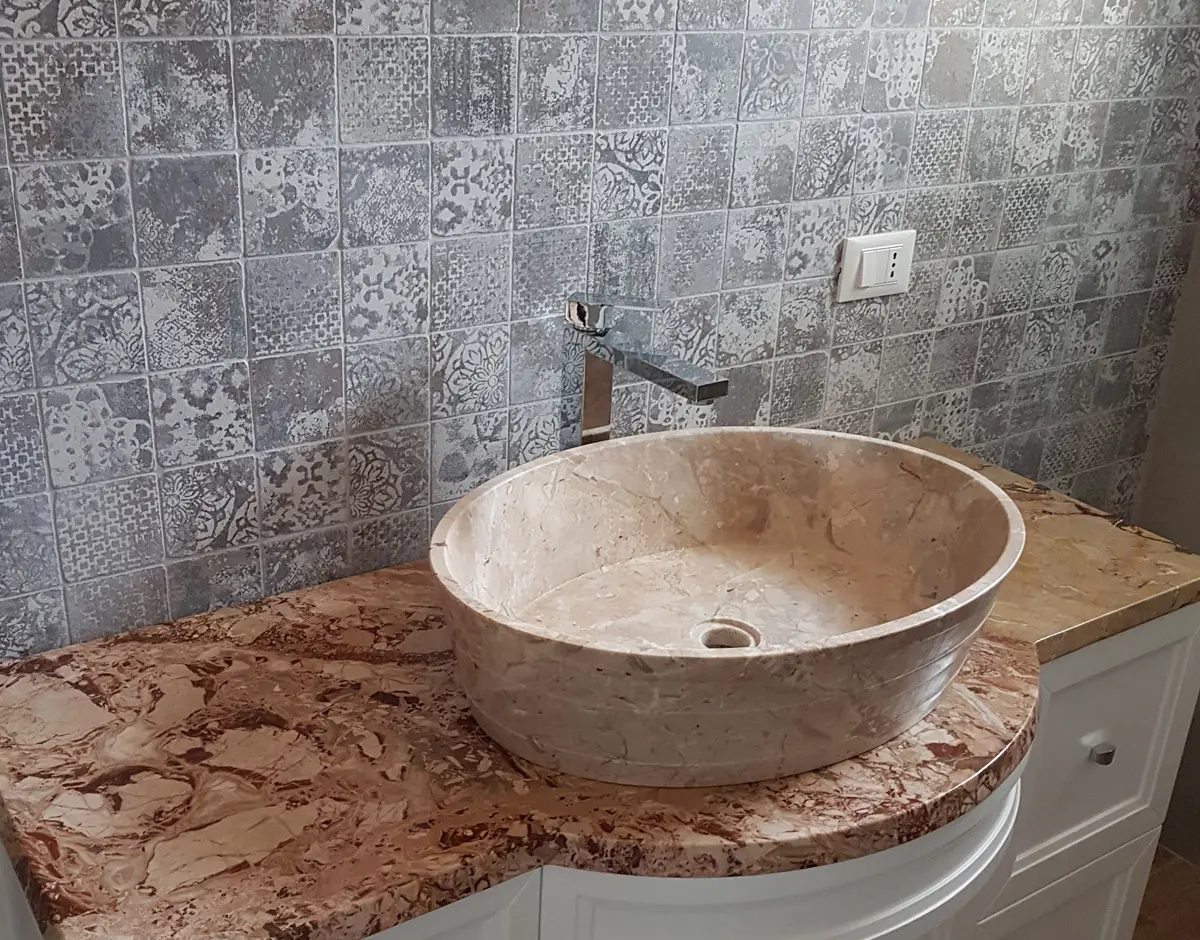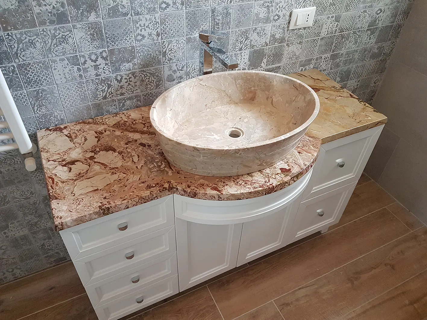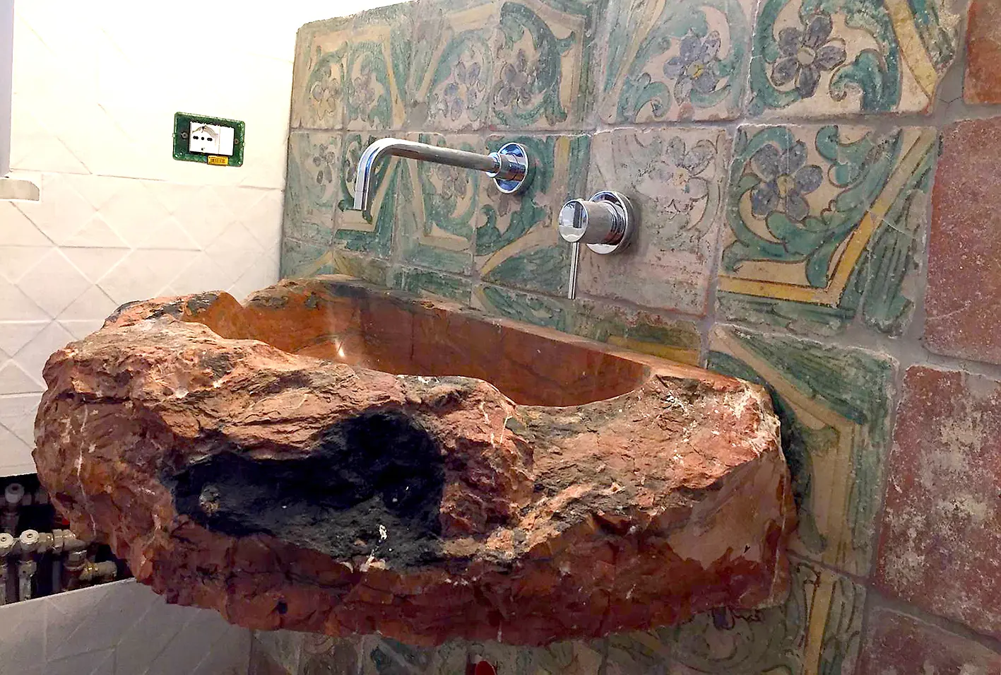 Lavabo in rosso di sicilia e piatto doccia in marmo grigio